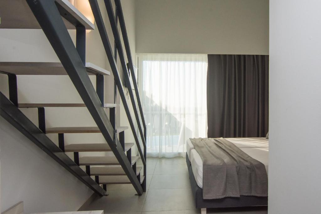 • Kényelmesen berendezett "Maisonette" típusú szobák, amelyek 4 fő elhelyezésére alkalmasak, 1 légteresek, 35 nm alapterületűek, galériával rendelkeznek (2 db ággyal a földszinten és 2 fős szofa ággyal az emeleten), TV, telefon, légkondícionáló, széf, wifi, minihűtő, vízforraló, hajszárító, zuhanyzós fürdőszoba valamint balkon/terasz. A szobák oldalról tengerre nézőek.